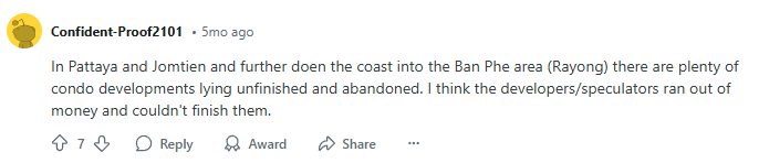 “在芭堤雅、宗滴恩以及更远的海岸边,班佩地区(罗勇府)有很多未完工或废弃的公寓开发项目。个人认为是那些开发商和投机者的资金耗尽了,无法继续完成这些项目。”
