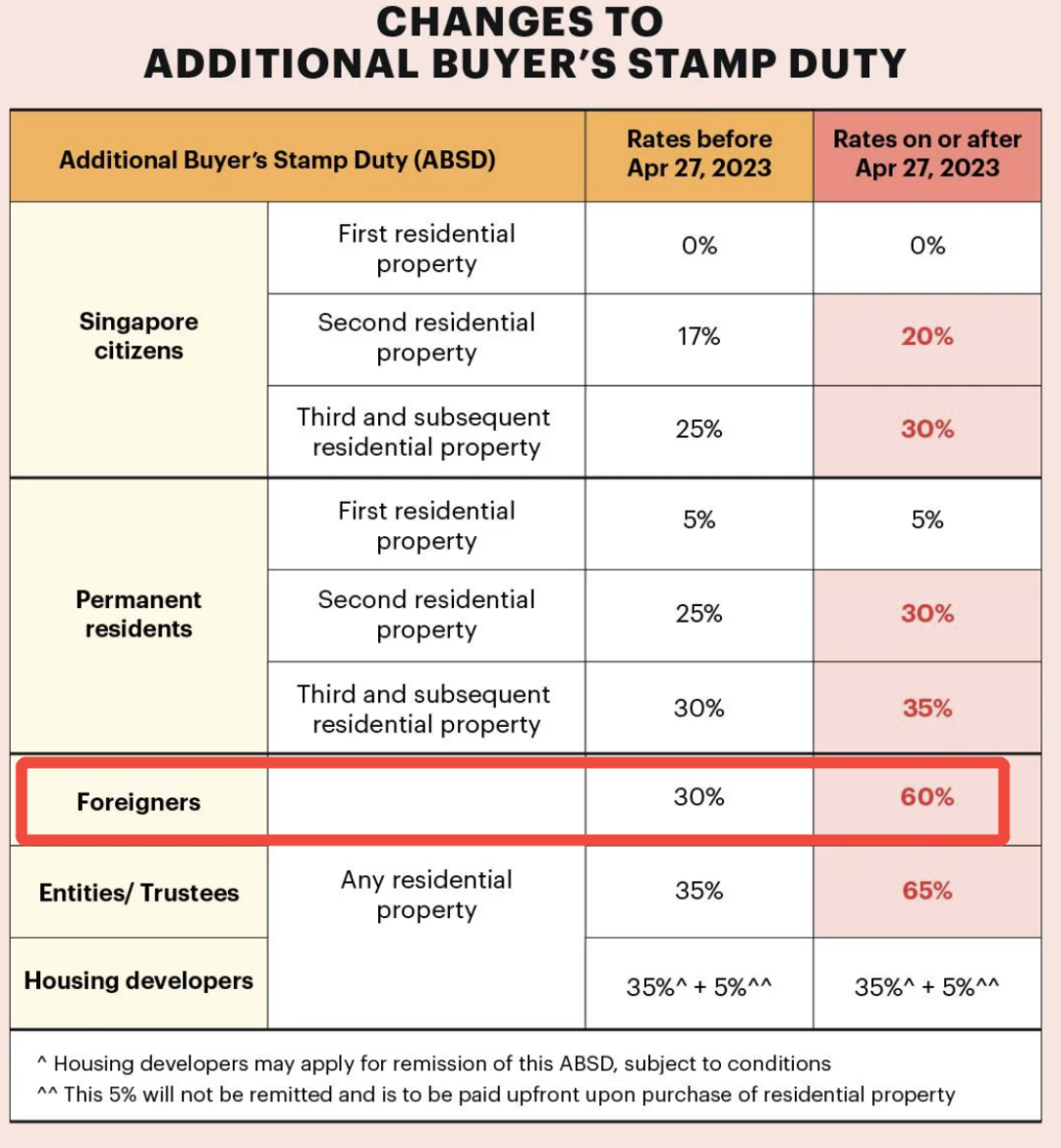 的确,由于新加坡为了控制房市升温,从2023年4月27日开始,政府将外国人购买住宅房产的额外买房印花税(ABSD)调高30个百分点,上涨至60%。