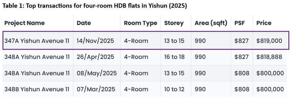 此次交易略微超越了此前保持的纪录——原高价纪录由义顺11道348A号另一间四房式组屋于今年四月创下,该单位位于16至18层,成交价为818,888新元(每平方英尺827新元)。