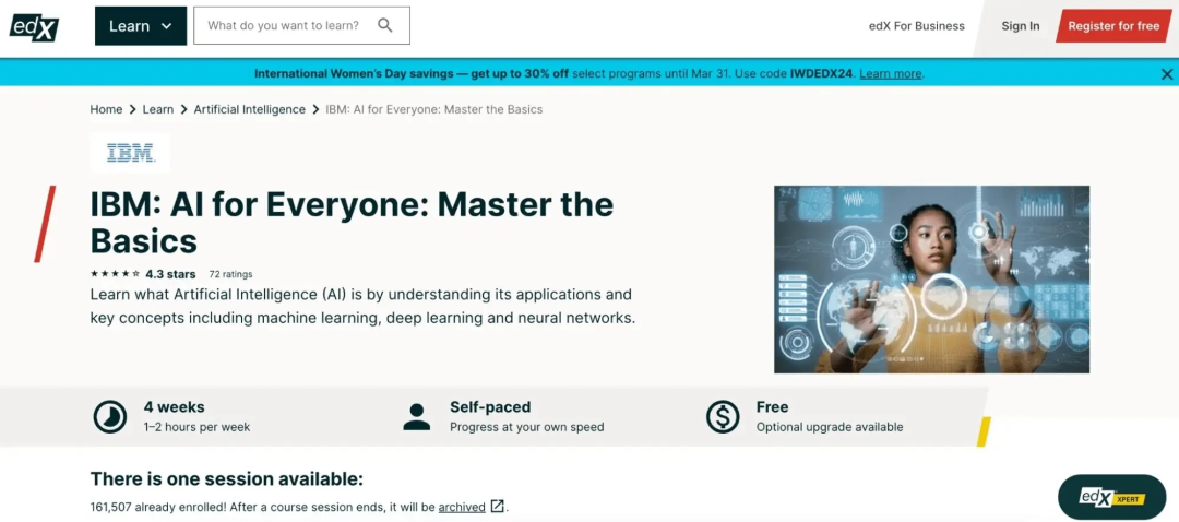 你可在https://www.edx.org/learn/artificial-intelligence/ibm-ai-for-everyone-master-the-basics找到更多关于该课程的内容。