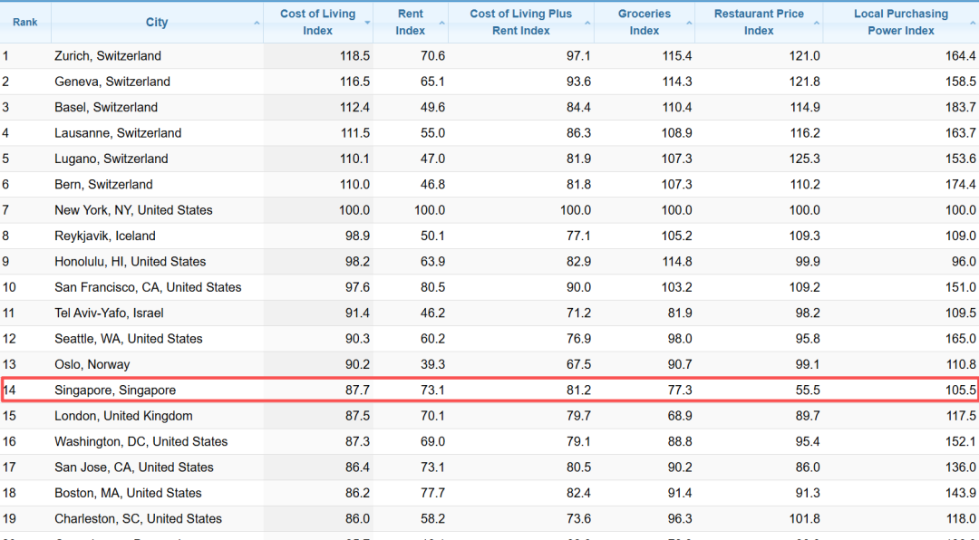 日前,全球最大的由用户贡献数据的、主要用于收集和比较全球各地的生活成本、房地产价格和生活质量指标在线数据库Numbeo公布了全球生活成本榜单,新加坡从之前第1位降到了第14。