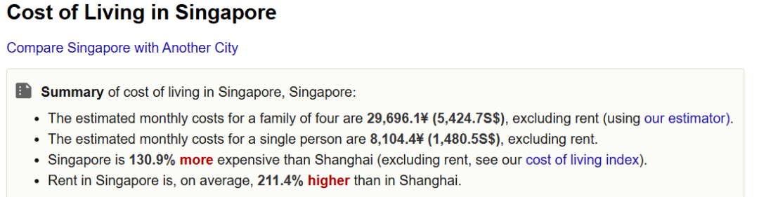 可以看出,新加坡和中国香港两地的打工族收入都算不错,因此物价相对于上海偏高或许也是正常现象。