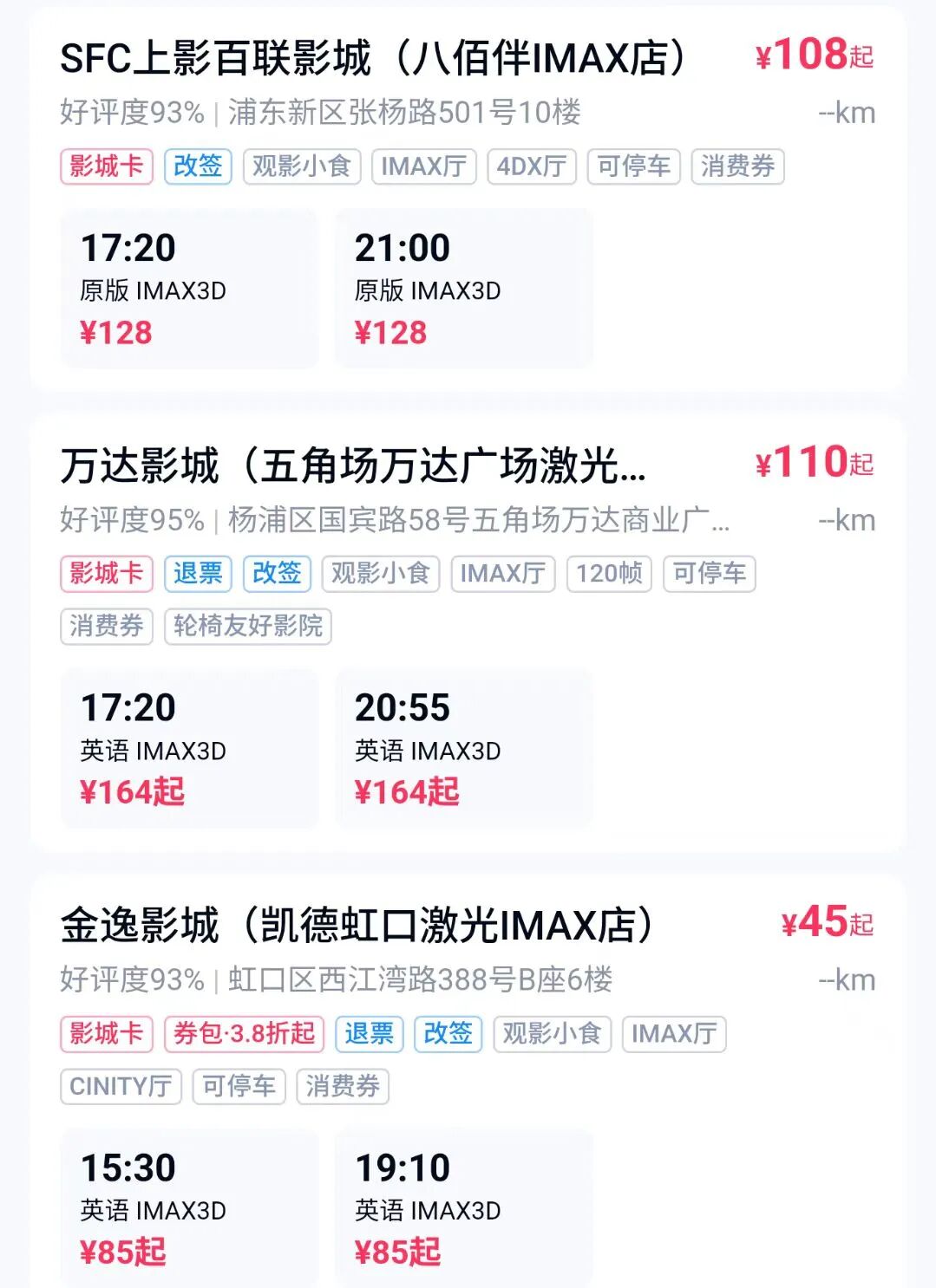 上海:就以看电影为例,前不久刚上映的《阿凡达3》(IMAX 3D),上海影院票价为85-160人民币浮动。
