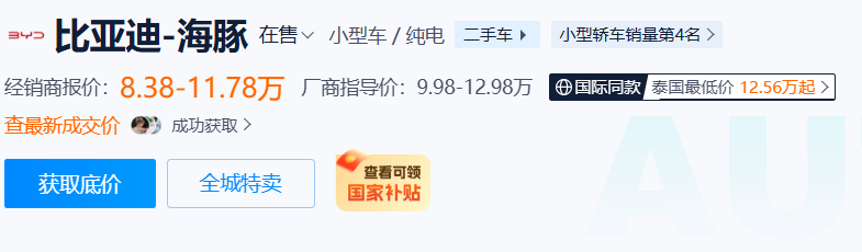 上海:以最近大火的比车型亚迪海豚为例,上海那边的报价8.38-11.78万人民币。