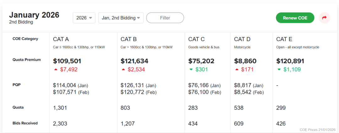 但是大家别忘了,新加坡还有全世界最贵的“铁皮”——拥车证COE!最新的COE价格,中小型车组要差不多11万新币,大型车组更是超过12万新币!