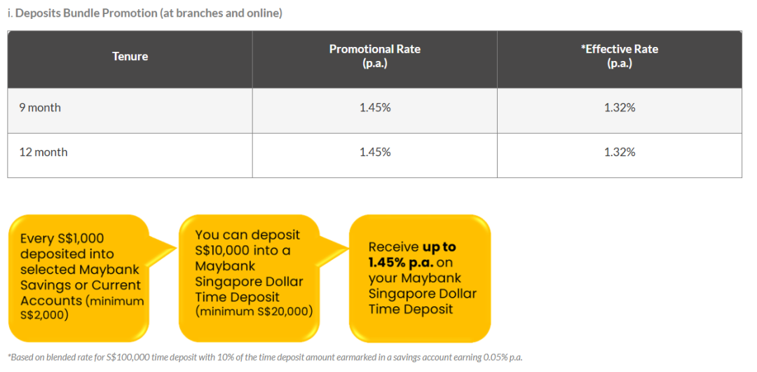 马来亚银行促销定存活动有两种选择,第一种是定存套餐,起存金额需要至少20000新币,且至少1000新币必须存入马来亚银行指定的储蓄或往来账户内:优惠利率为9/12个月,利率1.45%。