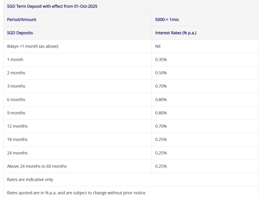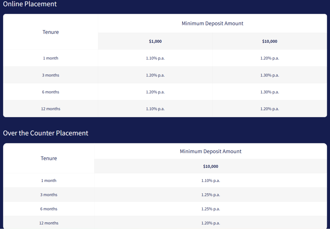 目前,该公司提供的最佳定存利率为3/6个月的1.30%。但需要注意,存入10000新币和只存1000新币,同样存期能够获得的利率有差异。