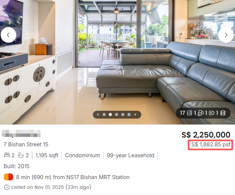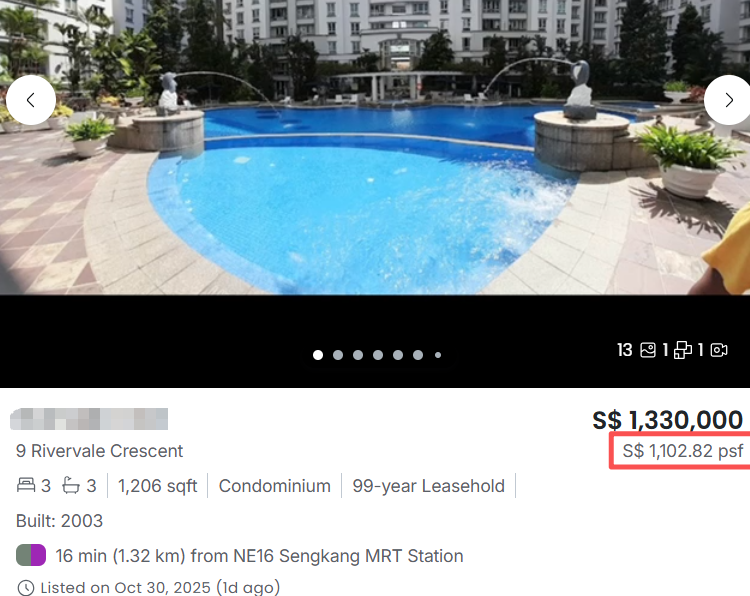 3)中央区以外(OCR)公寓价格普遍更低,尺价1500新币左右就能找到不错的房源,甚至还有一些挂牌公寓的尺价才1000新币出头: