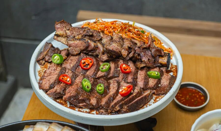 直落亚逸的 SOT 是新加坡首家用韩式传统大锅的韩料店,烧烤体验独特!Beef BBQ Platter(S$120)含牛胸肉、牛里脊、LA 排骨等共 600 克,搭配蘑菇、卷心菜和南瓜。