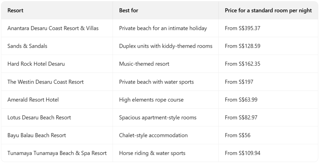 - 海滩度假村数量众多且各具特色,涵盖豪华私人海滩与家庭友好型水上乐园等不同类型,价格区间多元,最低仅 56 新元起,可适配各类住宿预算与体验需求。