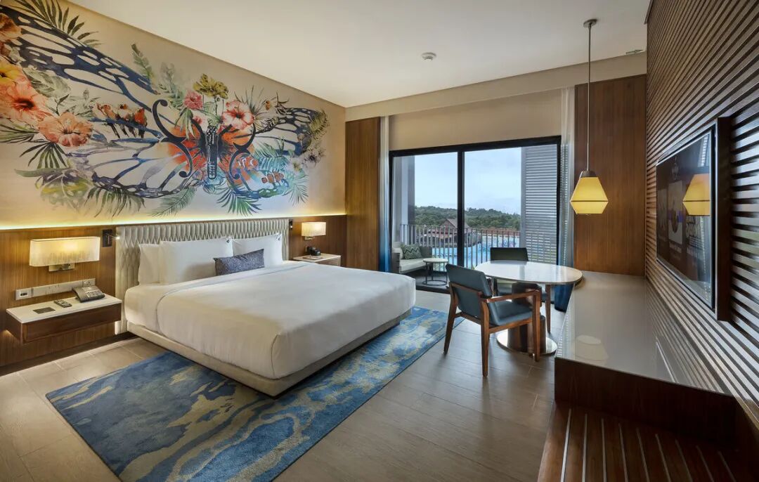 Hard Rock Hotel Desaru Coast 房型多样,从舒适高级房(162.35 新元起)到摇滚明星套房(542.82 新元 / 晚起),均具热带氛围且阳台可见水上乐园。