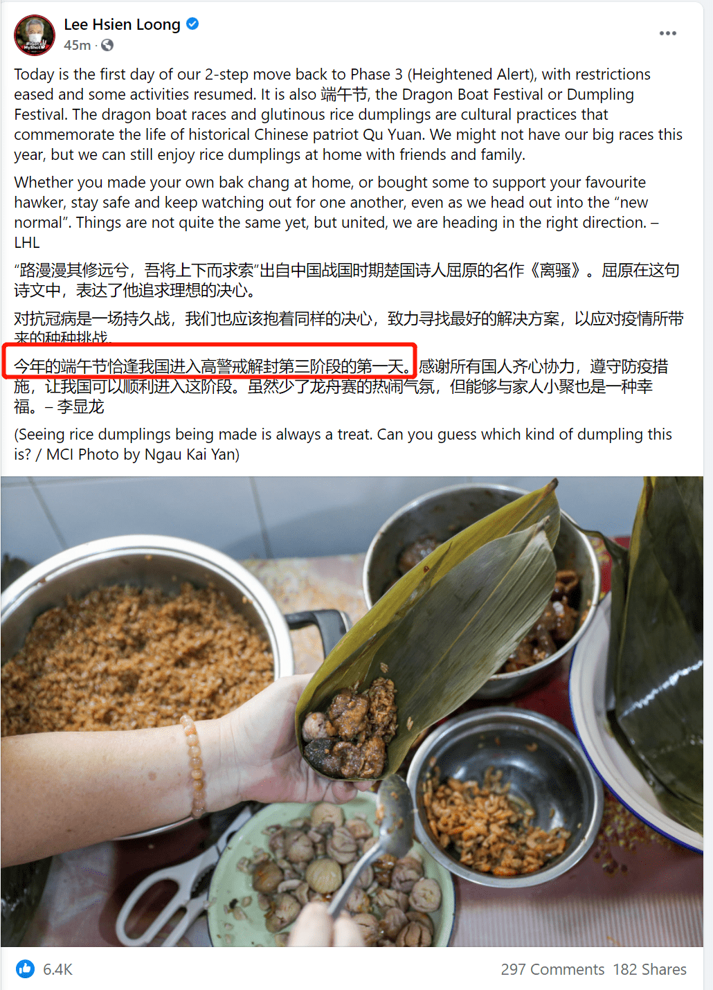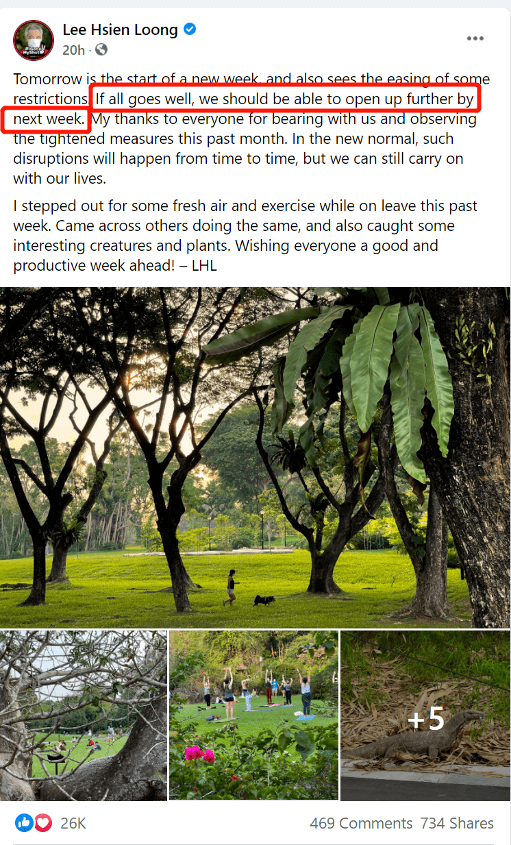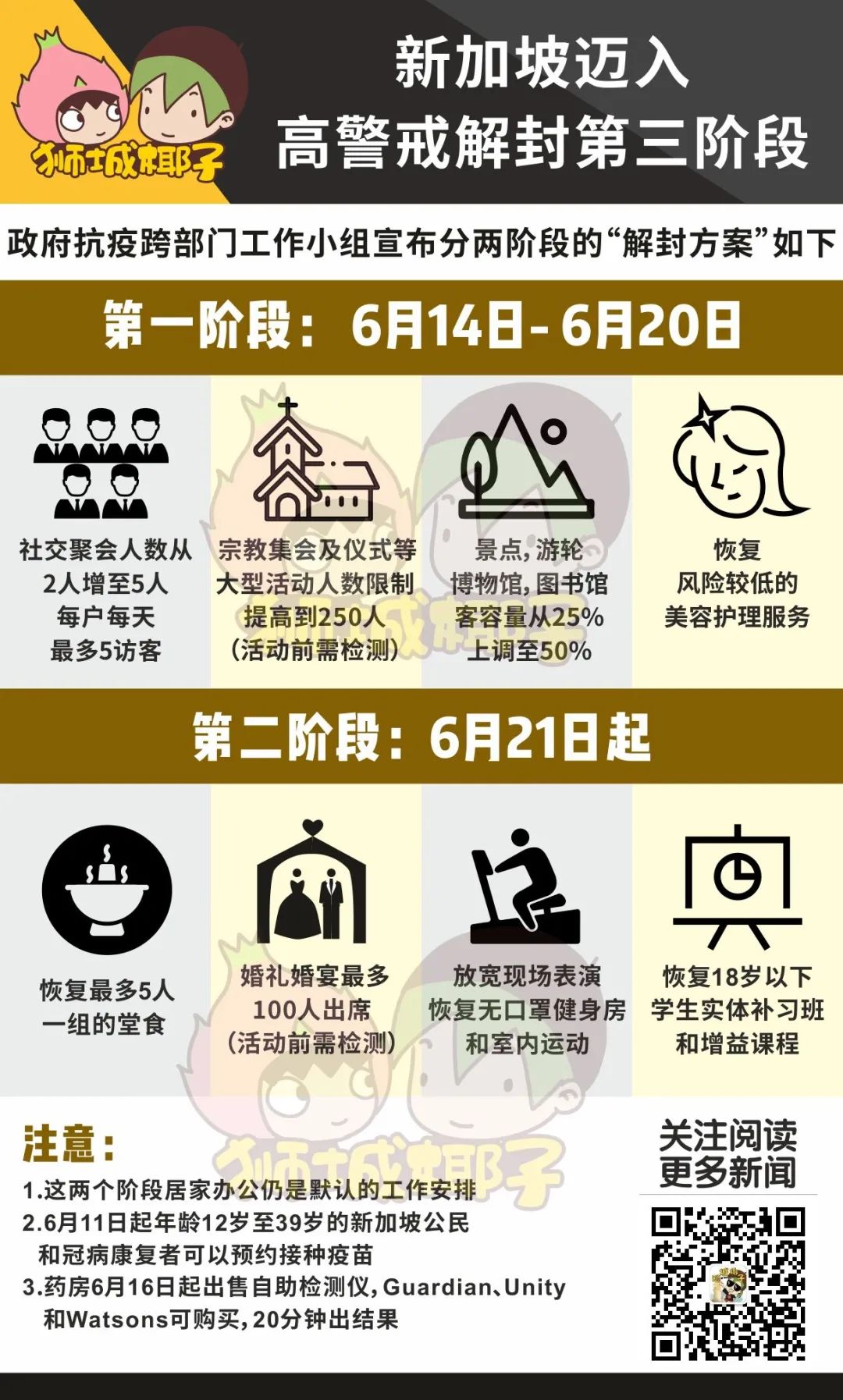 今天是什么大日子?李显龙总理发文提醒大家:今天除了是端午节,还是新加坡“半解封”的第一天!(图源:李显龙FB)李显龙总理发古诗词宣布进入解封新阶段李显龙总理罕见地发了双语贴文,还引用了屈原的《离骚》:“路漫漫其修远兮,吾将上下而求索”出自中国战国时期楚国诗人屈原的名作《离骚》。屈原在这句诗文中,表达了他追求理想的决心。对抗冠病是一场持久战,我们也应该抱着同样的决心,致力寻找最好的解决方案,以应对疫情所带来的种种挑战。今年的端午节恰逢我国进入高警戒解封第三阶段的第一天。感谢所有国人齐心协力,遵守防疫措施,让我国可以顺利进入这阶段。虽然少了龙舟赛的热闹气氛,但能够与家人小聚也是一种幸福。 – 李显龙图源:李显龙FB所谓“半解封”是指新加坡从“高警戒解封第二阶段”进入高警戒解封第三阶段,今天起,一系列宽放防疫措施的政策生效了!6月14日起【1】社交聚会人数从2人增至5人,每户每天最多5访客。【2】大型活动的人数限制提高到250人(超50人活动前需检测)【3】景点,游轮,博物馆,图书馆,客容量从25%上调至50%。【4】恢复风险较低的美容护理服务当然这只是解封的一个阶段,从6月21日起,还有会更多解封措施,包括大家很期待的“堂食”。刚刚!教育部也有了新的开学通知:从2021年6月28日星期一开始,小四至小六、中三至中五和所有JC/MI学生将返回学校。1)中一和中二的学生将进行在家学习(HBL),直到2021年6月30日星期三,并从2021年7月1日星期四开始返校。2)小学1至3年级的学生将在第一周进行在家学习,学校将继续为学生提供指导和支持,以获取在线居家学习材料。3)所有年级的学生将从2021年7月6日星期二起返校,因为2021年7月5日星期一是学校假期(青年节)。昨天,李显龙总理也在另一贴FB里面提到:“如果一切顺利,下周就可以再进一步放宽更多措施。谢谢大家过去一个月的忍耐,配合政府遵守之前须收紧的措施。”这个阶段,解封措施里面对我们生活影响最大的就是社交规模从2人提升到5人。这就意味着一家老小可以出门啦,非饮食类的聚会也能搞起,出租车搭载超过两个以上的乘客。经过了长达四周的居家,新加坡有些人已经迫不及待!(图源:mothership)这种变化我们昨天就看到了。有网友在Facebook上面Po出照片,昨天早上大批人早前往樟宜海滩“赶海”!退潮时到潮间带(intertidal)会有大量的海洋生物被滞留,所以海滩上人满为患,大人带着小孩捡拾螃蟹、贝类和海葵等。(图源:FB@Daphne Ting)(图源:FB@Daphne Ting)位于芽笼士乃的女佣聚会场所昨天也重开,现场有些帐篷,除了聚餐可以在此停留。(图源:海峡时报)到了今天,大家就更Happy了!虽然是周一,动物园的人也一下子多起来。这一阶段,除了放宽人数至5人,景点的客容量也增加到50%,意味着更容易预约到时段。这两个措施看起来简直就是为了溜娃的家庭而设。(图源:早报)现在依然正逢学生假期,一堆“熊孩子”正愁没地方去,措施一放宽大家就犹如出笼鸟飞去了~午饭时间,可以看到街上的人也多了起来。街上有明显超过2人一组的一起行动。三五好友或者一家几口出门的很多。目前食阁仍然不让堂食,在21号之前,人们还是需要出门打包。(以上图源:网友实拍)社区病例反弹中48个感染群让人担心新加坡这两天的病例情况似乎又有所反弹。今天社区达到了18例!是一周以来的新高。昨天新增13例病例中,包括社区病例十起,输入型病例三起,累计病例达到6万2276起。输入型病例当中,有两人是从印度返回新加坡的本地永久居民,另一人是从印度尼西亚入境的外籍女佣。输入病例已经不足畏惧,社区病例却又重回两位数!新增两起无关联社区确诊病例,他们分别是已完成疫苗接种的后港众圣之家疗养院的23岁护理人员,以及一名27岁的工程师。 27岁印度籍工程师(第64184例)又与早前2例原本被判定为无关联的病例,形成了一个新的感染群。【27岁印度籍工程师感染群】早前两例包括一名19岁本地女子和一名39岁本地妇女。她们两人是家属关系,并与第64184例同住。19岁女子在物流公司DHL Express (Singapore)担任仓库助理,而39岁妇女则受雇于清洁公司Cleen First Services,在翡翠园(Emerald Park)公寓担任清洁工。【红山景第115座巴刹与小贩中心感染群】小贩中心感染群新增四例,因为深入社区,又是大型的巴刹和小贩中心,这里的情况有点复杂(下文详细描述)。红山景第115座巴刹与小贩中心感染群和27岁印度籍工程师(第64184例)感染群出现,让新加坡当前的活跃感染群增加到48个!小小的新加坡社区,竟然有48个感染群。小贩中心感染群关系错综复杂确诊者已接种疫苗这几天最受关注的感染群莫过于红山景第115座巴刹与小贩中心。(图源:谷歌)这个有着167个巴刹摊位和84个熟食摊位的大型巴刹和小贩中心,因为病例激增从昨天起关闭三天,彻底清洁和消毒。昨天这里的感染群新增4例,累计6个确诊,感染线路也越来越清晰。【新确诊1】72岁新加坡籍老爷爷(第64193例),巴刹杂货店员【新确诊2】67岁新加坡籍妇女(第64195例),巴刹熟食摊主【新确诊3】65岁新加坡籍男子(第64196例),巴刹熟食摊主【新确诊4】50岁孟加拉籍男子(第64187例),Theng Liang Lee Services,在巴刹担任杂工(conservancy worker)四人全部是早前确诊在巴刹服饰店的74岁老翁(第64132例)的密切接触者,早前第二名确诊者也是74岁老翁的接触者。【首名确诊者】74