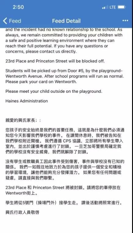 校方随即向所有学生家长下发了中英文的紧急通知,告知校园发生紧急状况,被临时封锁。