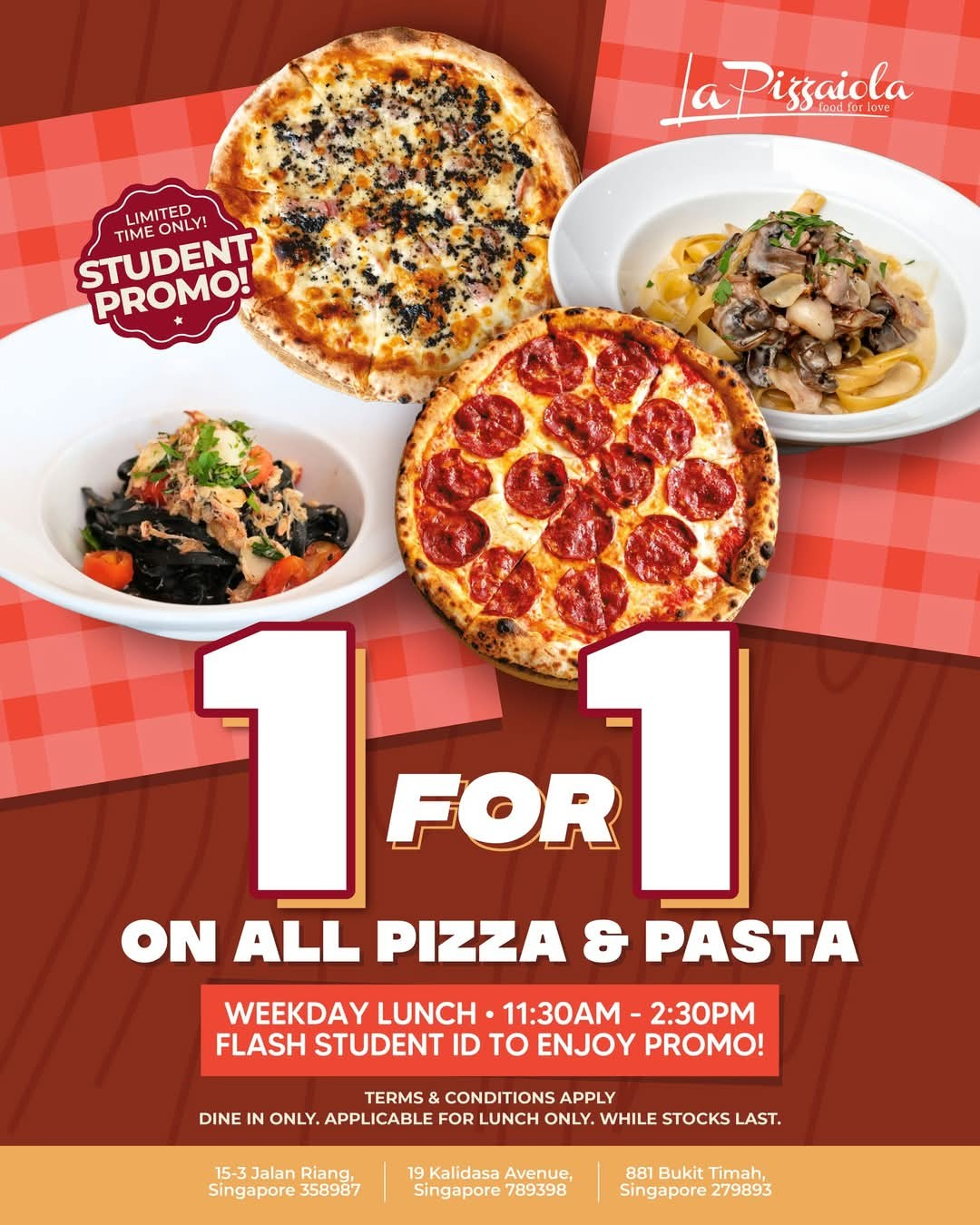准备好在工作日的中午享受意式风味吗?学生们只需在指定的午餐时段出示学生证,就可以在这里享受全店披萨和意大利面的买一送一优惠。