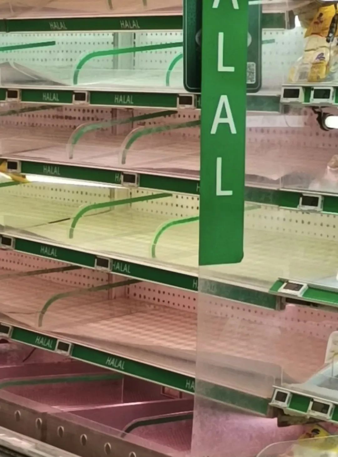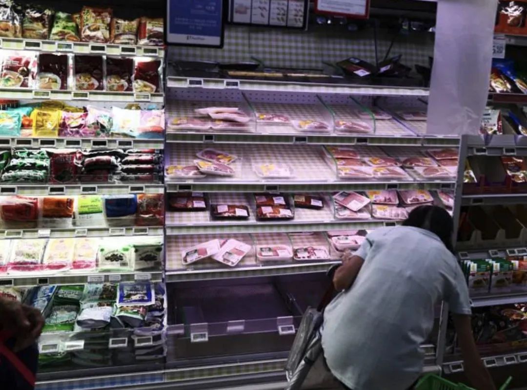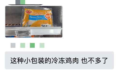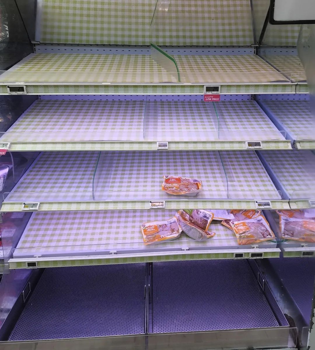 有的超市货架,鸡牛羊猪肉可能是同一柜。从肉的颜色来看,鸡肉明显也被拿完了~↓