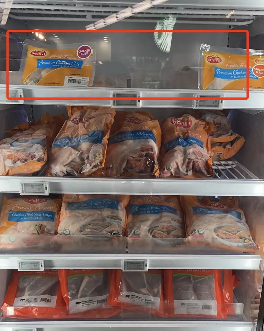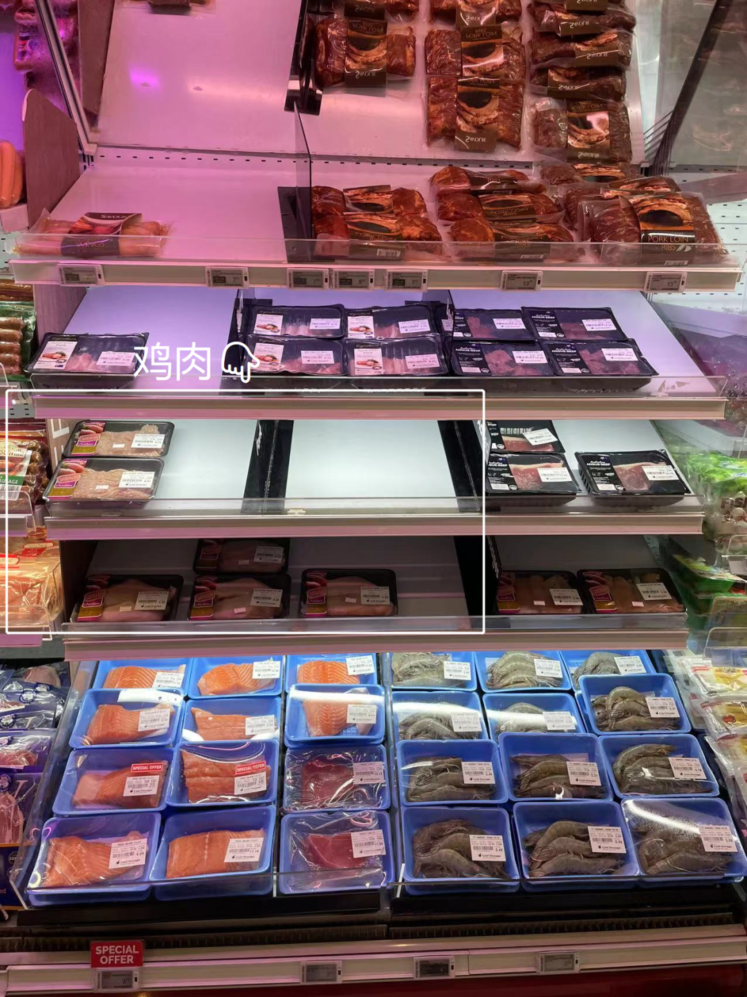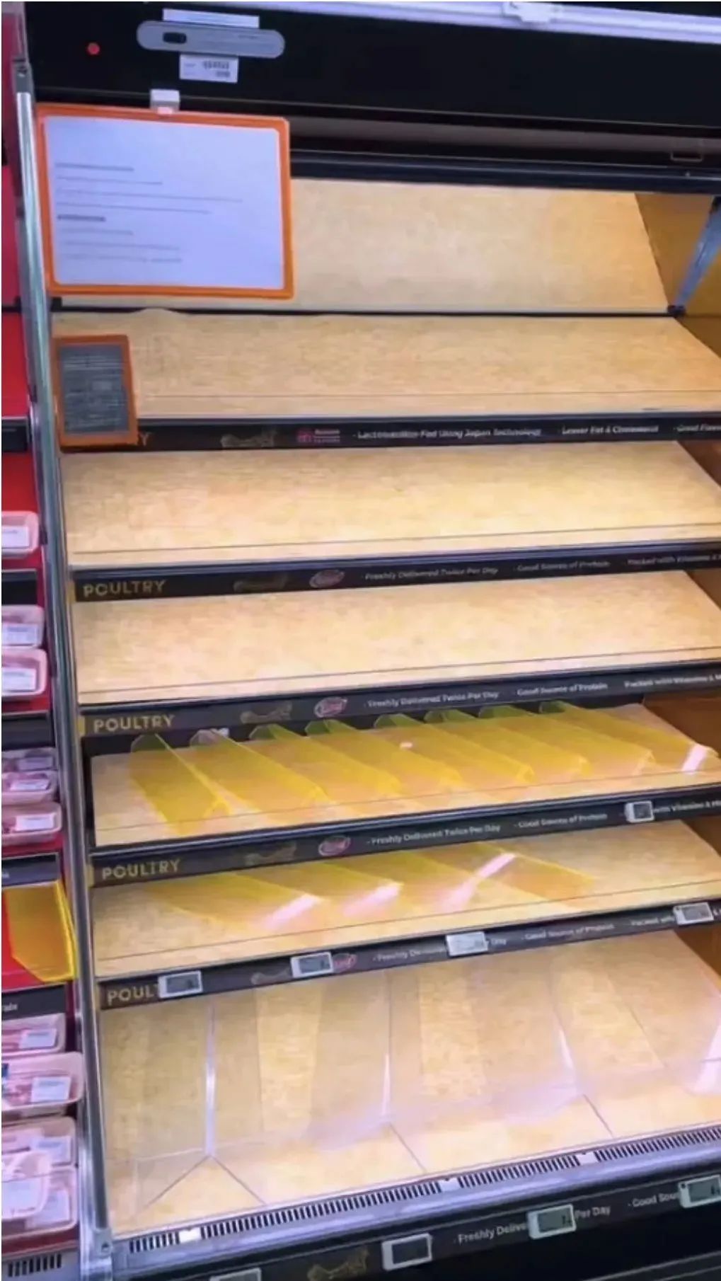 有的超市货架,鸡牛羊猪肉可能是同一柜。从肉的颜色来看,鸡肉明显也被拿完了~↓
