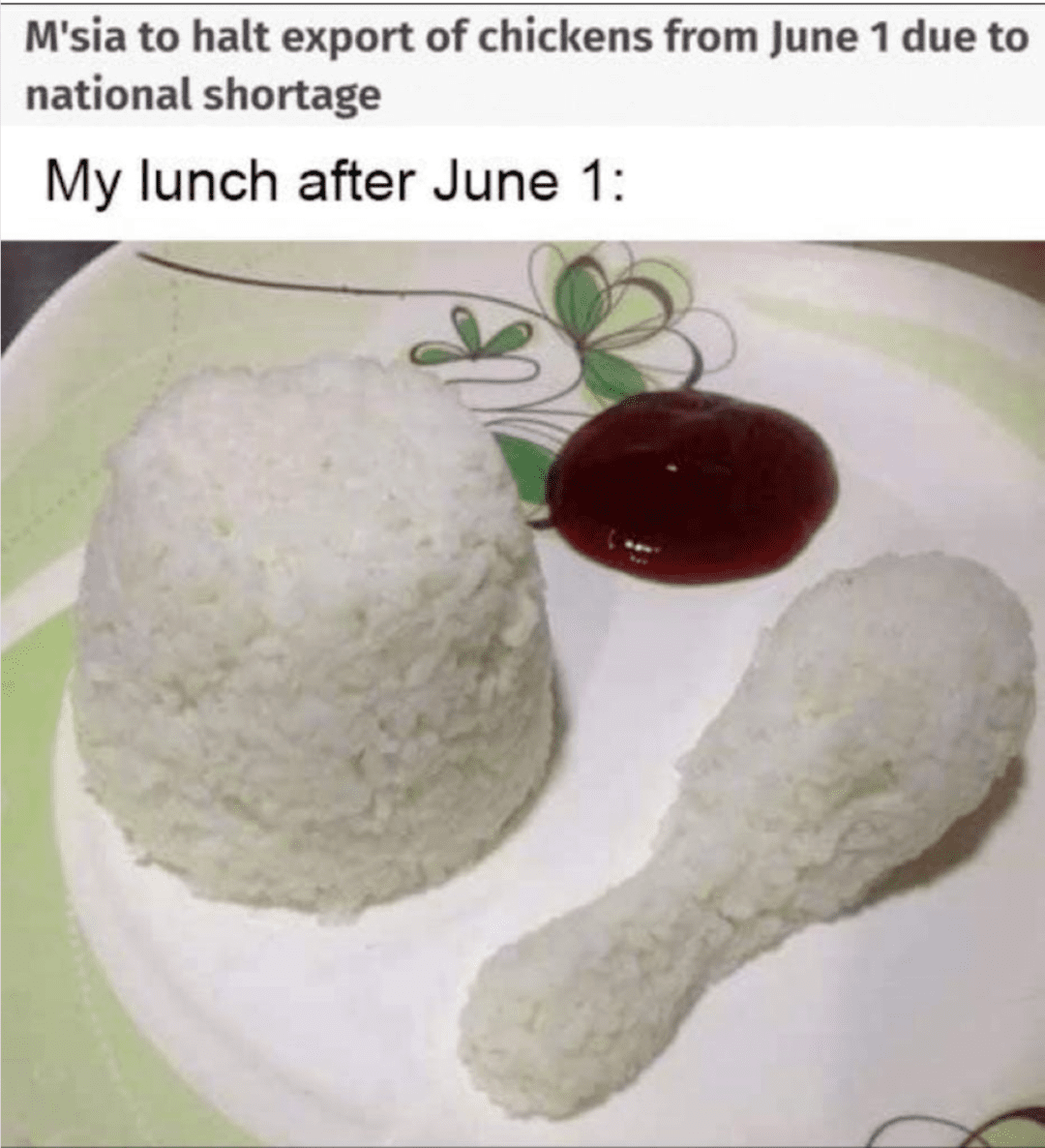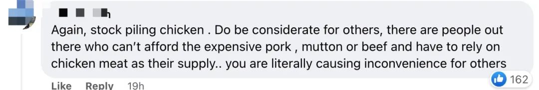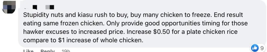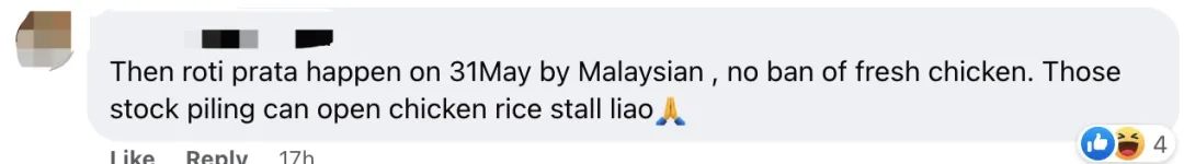 “说不定到5月31日马来西亚又后悔了。不再禁止出口鲜鸡。现在这些人囤的鸡已经够开一个鸡饭档口了。”