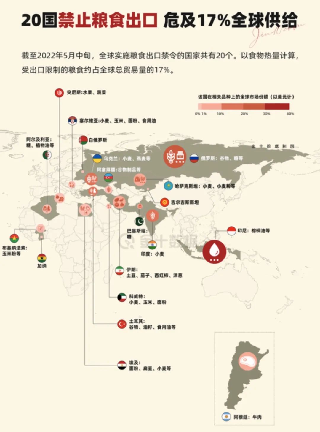 包括印度在内,截止到5月中旬,全球实施粮食出口禁令的国家已经至少20多个!