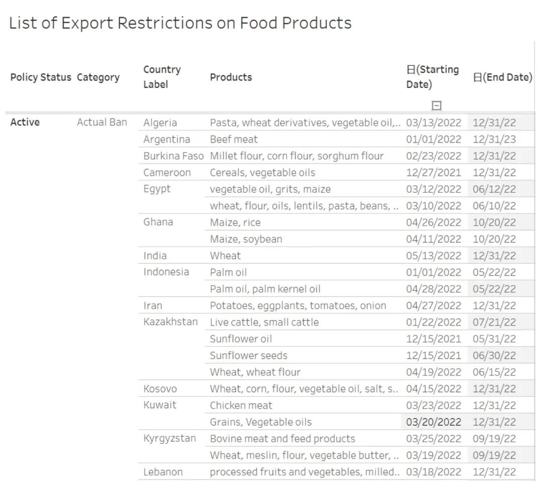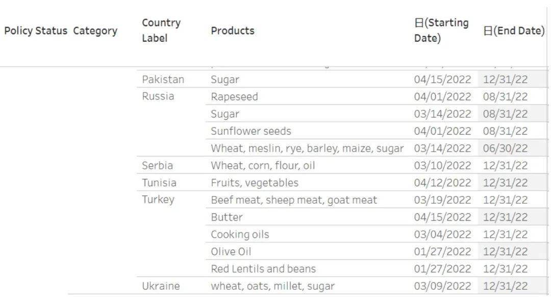 (部分食品出口禁令,至少持续到2022年12月31日)