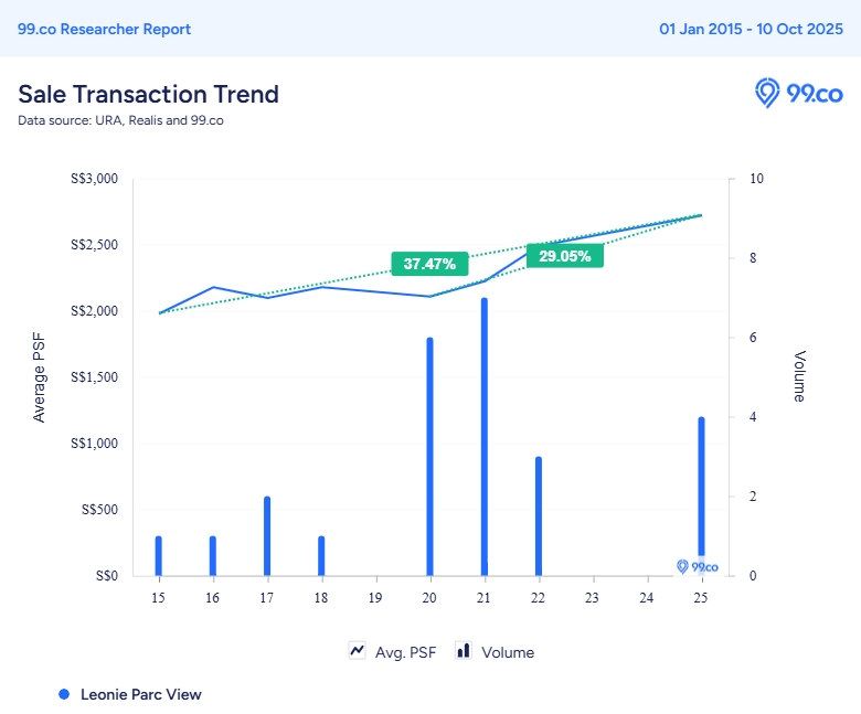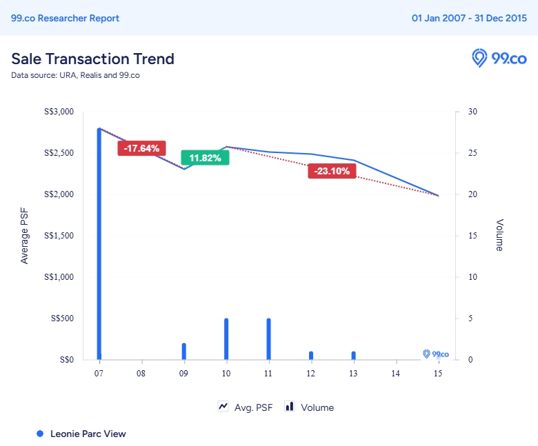 由Soilbuild集团开发的Leonie Parc View共有44个单位,于2007年以平均尺价2793新元推出市场,当时售出近30个单位。随后全球金融危机爆发,导致价格在2009年暴跌18%,至约2300新元尺价。