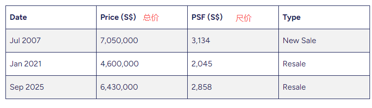 这笔交易的突出之处在于其相对较短的持有期。业主于2021年1月疫情期间市场低迷时,仅以460万新元(尺价2045新元)购得此单位。