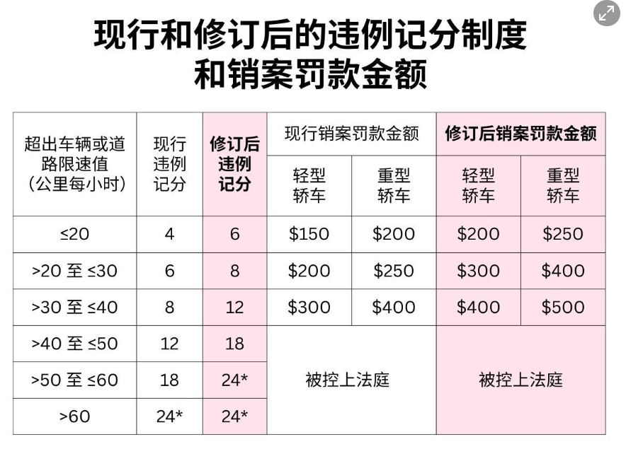 根据不同车型以及超出的限速值,修订后的销案罚款金额将调高50新至150新不等;违例记分则将提高两分到六分不等。如下图所示: