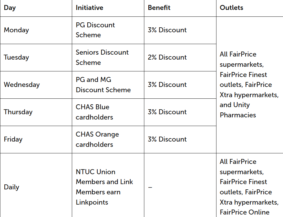 建国一代(PG)、立国一代(MG)以及橙色和蓝色社保援助计划卡(CHAS Card)持有人可分别在每个星期的指定日子里,享有2%到3%的折扣优惠。