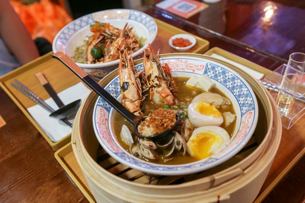 Cuppage Plaza 的隐藏宝石 Ebi Bar,虾控必打卡!招牌 Modern Prawn Noodle(15.90 新元起),弹簧拉面配焦虾浸浓郁虾汤、 Ebi Bar Hokkien Noodles (19.80 新元起)搭茶虾同样热门,想吃轻盈口可选 Pan-Seared Chicken Noodles(10.80 新元起)。