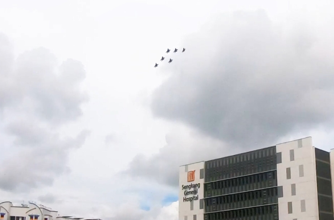 - SG60 庆典有 F-15SG、F-16 特技,四编队协同展国防力,8 月 10 日,四架 F-16 以钻石队形环岛飞行。