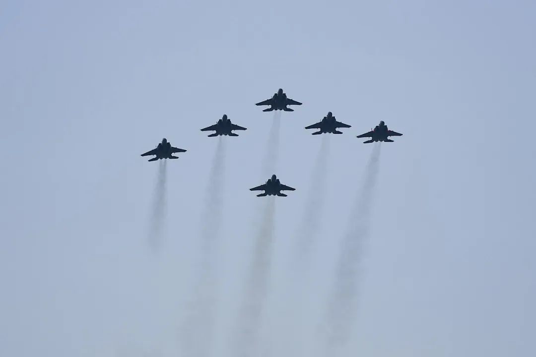 六架 F-15SG 战斗机从两个相反方向接近草场,相互飞过后,便进入全力加力爬升状态,值得留意。