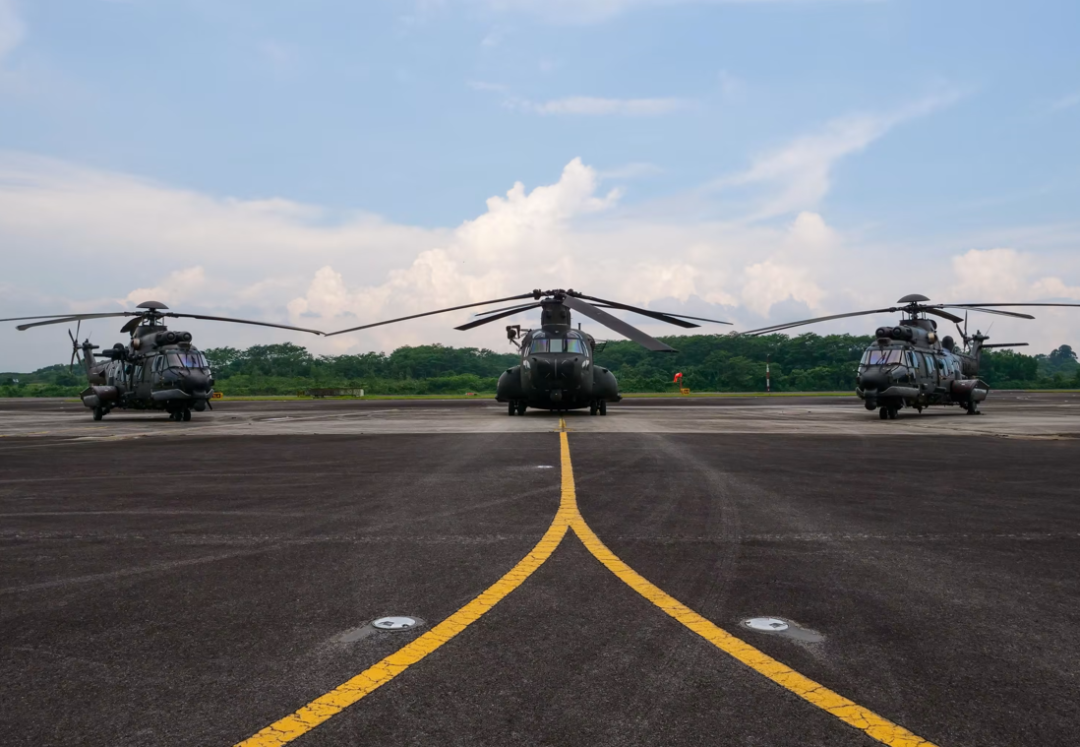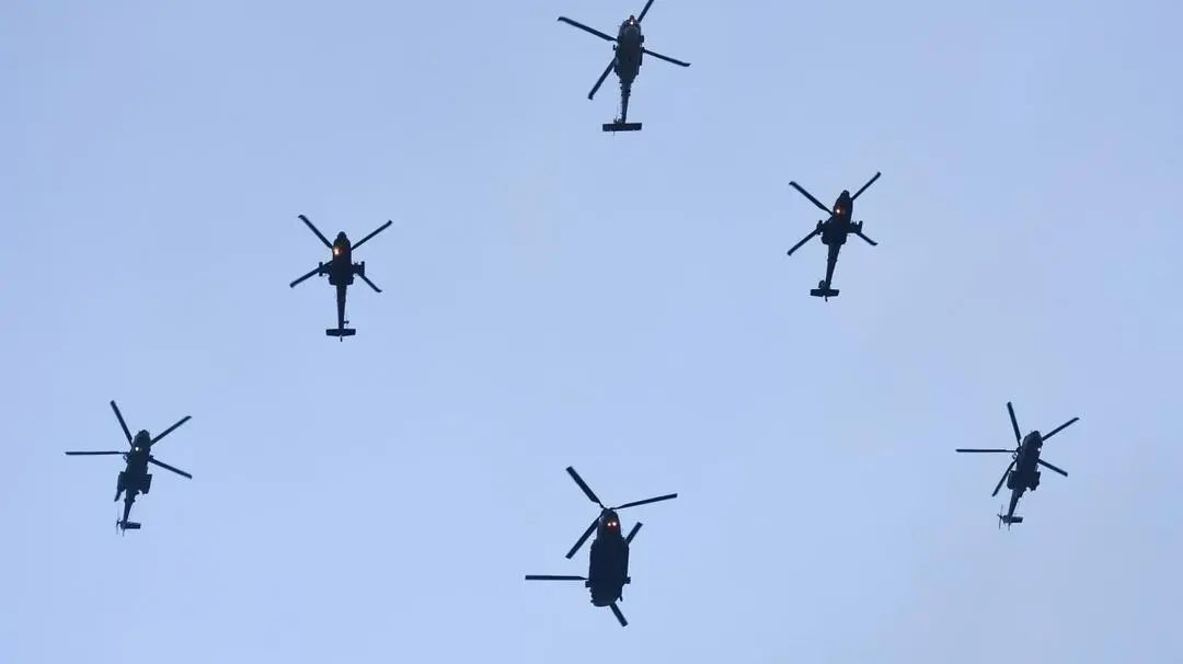 从南线高度飞入的有一架 S-70B 海鹞、两架阿帕奇攻击直升机、两架 H225M 中型直升机及一架大型 CH-47。