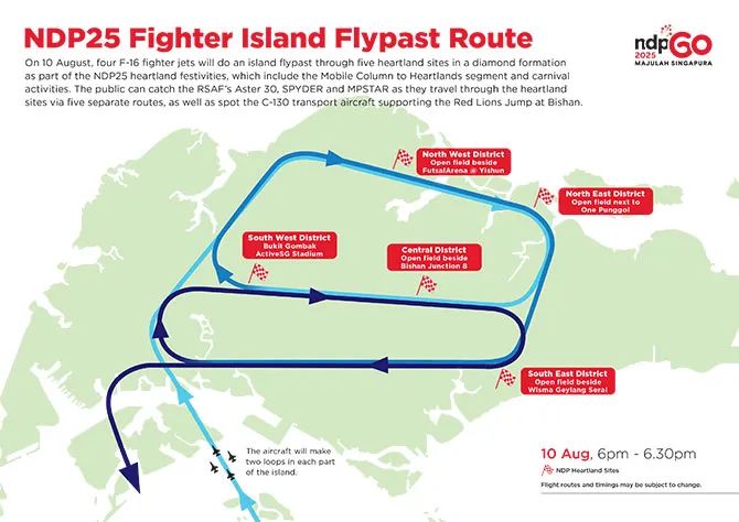 在2025年,经典的环岛飞行将在8月10日拉开帷幕,四架F-16战斗机将以钻石编队在下午6点至6点半间从南向穿越新加坡全境。