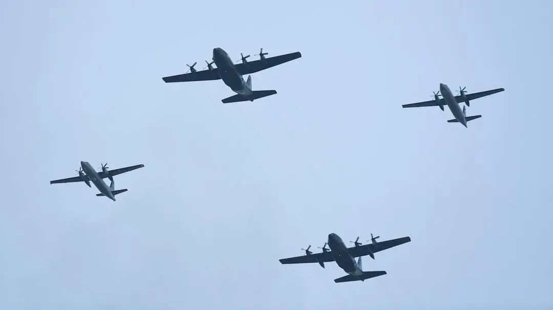 最后一个编队由两架 C-130 大力神飞机和两架从东部飞来的福克 - 50 运输机组成,用以展示人道主义援助及和平支持行动的资产。