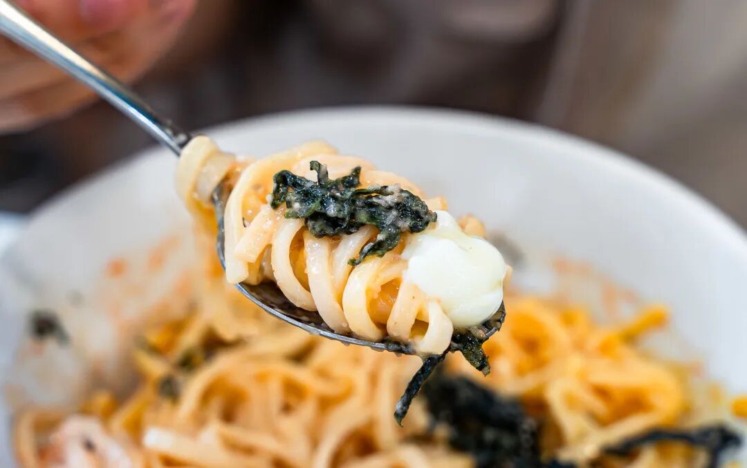 招牌 Carbonara Udon(24新元 ),浓厚乌冬裹着芝士蛋香的柔滑酱汁,搭配蓬松培根天妇罗,风味浓郁 decadent,创意与经典兼具,盛名不虚。