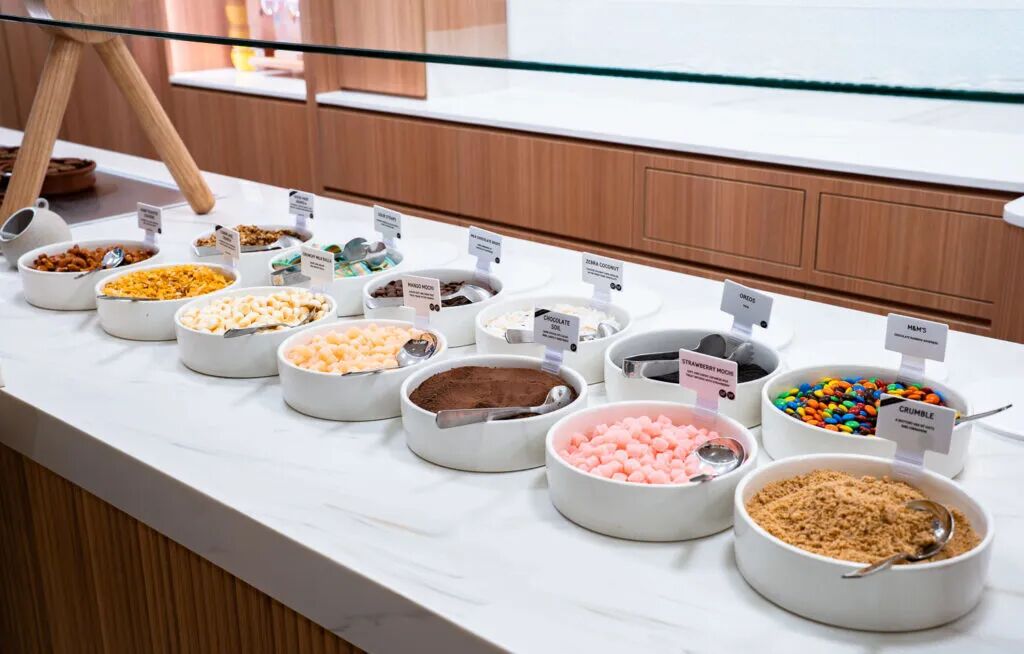 以澳洲鲜奶制作,10 种风味可选,低卡、98% 无脂且富含益生菌,按重量计价(每 100 克 3.50新元)。推荐 Salted Butterscotch 风味,甜咸平衡,和 Matcha 风味搭配也很和谐。
