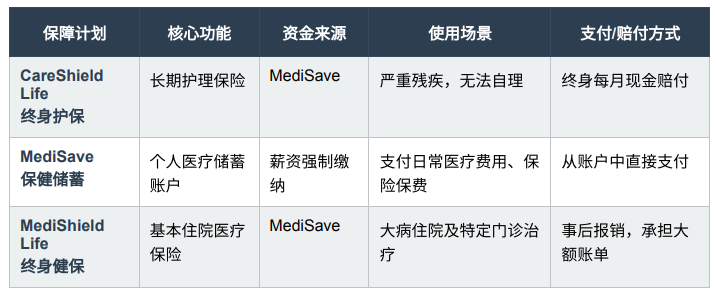 除了CareShield之外,新加坡还有Medisave和MediShield Life两种医疗保健计划。这三者共同构成了新加坡全民医保体系的三大基石: