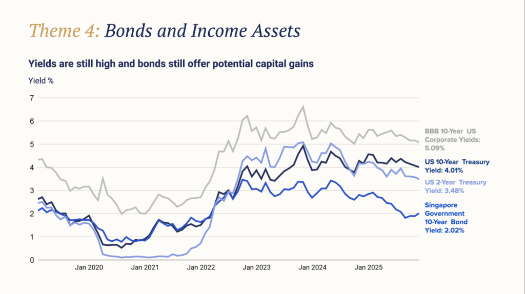 随着政策利率预计将向中性水平回落,债券既能提供票息收益,也具备资本增值潜力。利率波动性下降亦有益于各类收益型资产。