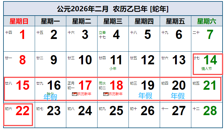 明年新加坡的农历新年假期为2月17日和18日,因此,我们只需要2月16日(星期一),以及2月19日、20日(星期四星期五)请三天年假,同样能享受9天的长假!