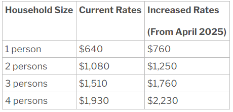 ③长期援助:针对持续面临财务困难的家庭。援助通常以月度现金援助形式发放,社会工作者也会协助联系工作匹配、培训或医疗津贴。这个补助的金额会根据家庭内成员数量增加,如下图所示,最高一个月有2230新币。