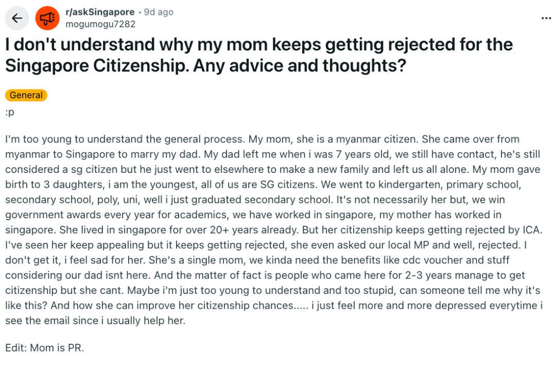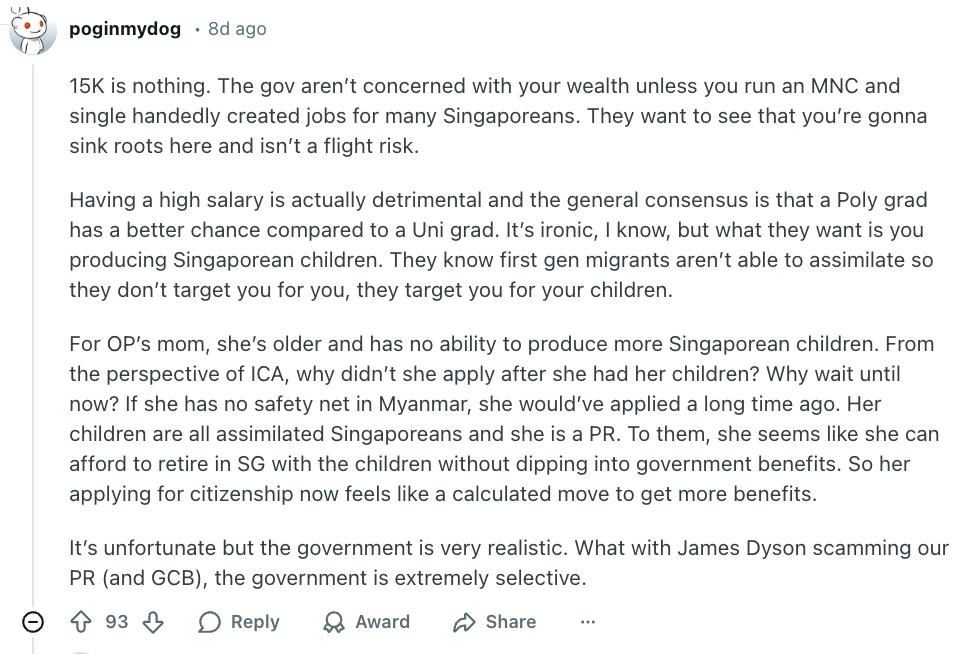 对于楼主的母亲来说,她年纪大了,没有能力再生育新加坡公民子女。从移民与关卡局(ICA)的角度来看,她为什么不在生完孩子后就申请入籍?为什么等到现在?如果她在缅甸没有经济保障,她早就申请了。她的孩子们都已经融入新加坡社会,而她本人也是永久居民。在他们看来,她似乎完全有能力带着孩子们在新加坡安享晚年,无需动用政府福利。因此,她现在申请入籍看起来像是为了获得更多福利而精心策划的举动。”