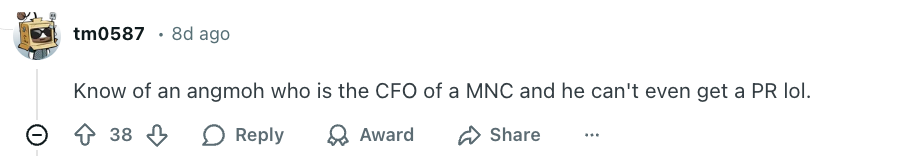 “我认识一个在跨国公司担任首席财务官的洋人,曾拒绝吉隆坡一份薪水更高的工作,因为他更喜欢新加坡,但是到现在他连个PR都拿不到。”