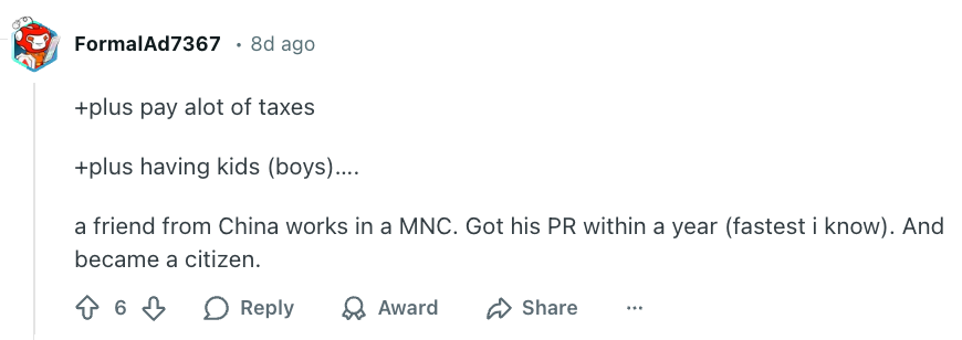 “此外还要缴纳大量税款,再加上生儿子……我有个朋友是中国人,在一家跨国公司工作。他一年之内就拿到了永久居民身份(据我所知是最快的),后来还入籍了。”