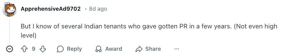 “但我认识好几个印度租户,他们都不算收入很高的,在几年内就拿到了PR(永久居留权)。”