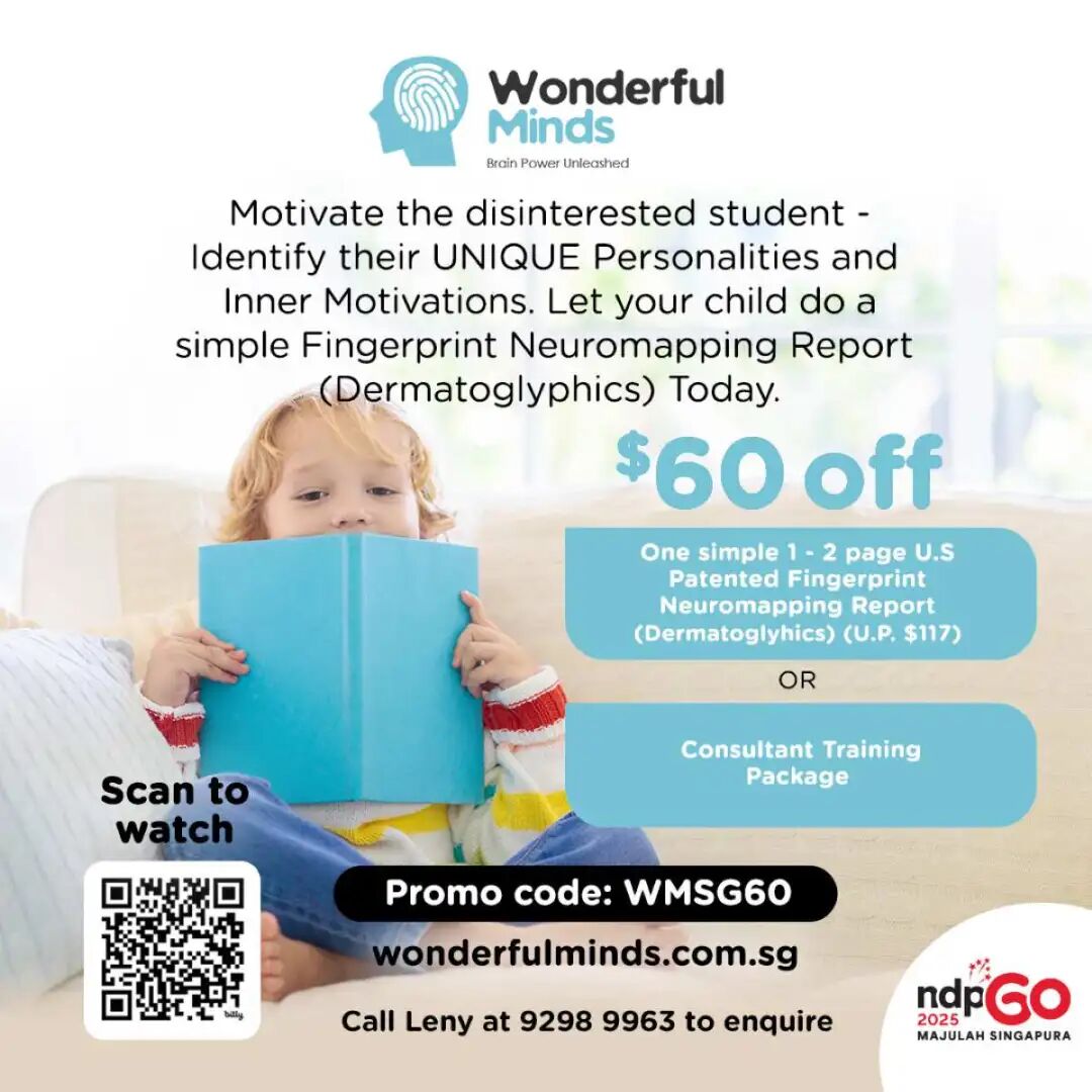 2025 年 9 月 30 日前,Wonderful Minds 的 1-2 页美国专利指纹神经图谱报告或顾问培训套餐享 60 新元折扣(原价 117 新元),可助发现才能弱点,适各年龄段。