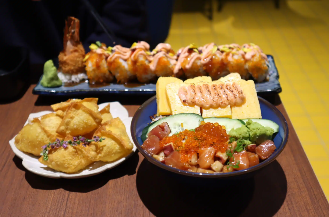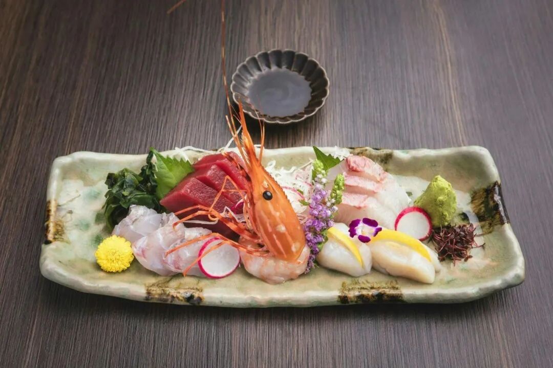 食材每周三次从日本空运,保证生鱼片新鲜,寿司拼盘套装(起价 59 新元)含 10 种寿司,还可搭配各类配菜及单点菜品。