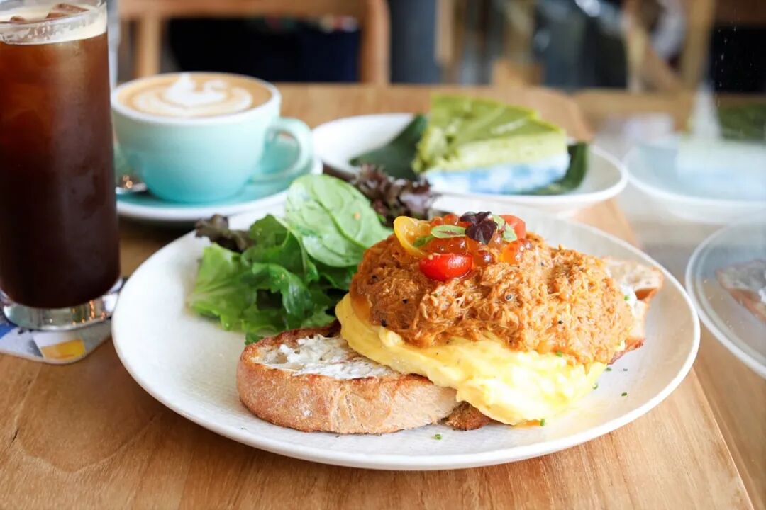 The Brewing Ground 餐品价格略高但份量足,推荐 26 新元的 The Brewer's Breakfast(含薯饼、培根等可自选),还有 27 新元的Crab Mayo and Signature Scrambled Eggs,奶油蛋中满是鲜蟹肉与鱼子。