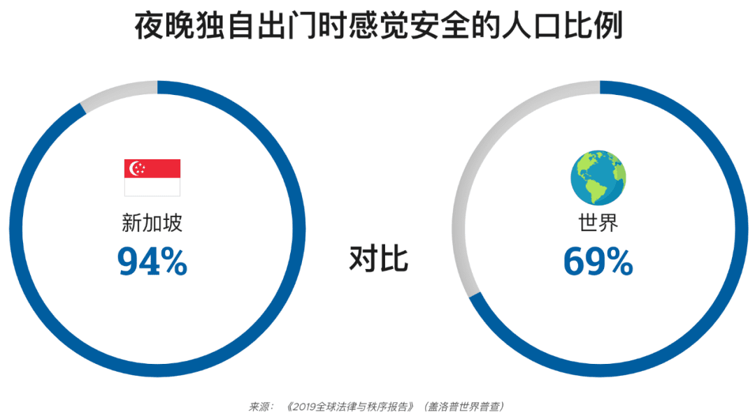 有94%的人认为在新加坡的夜晚独自出门很安全,而世界上只有69%的人感觉夜晚独自出门会安全。