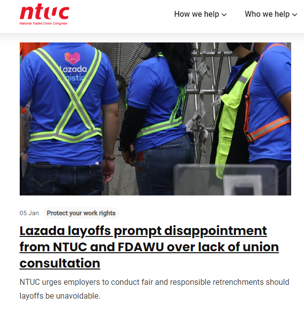 工会声明指出Lazada已加入了职总旗下的食品饮料及同行业工友联合会(FDAWU),在裁员前应遵守NTUC公平裁员框架来进行,而不是直接进行。现在工会对此“深表失望”,并已通报人力部。