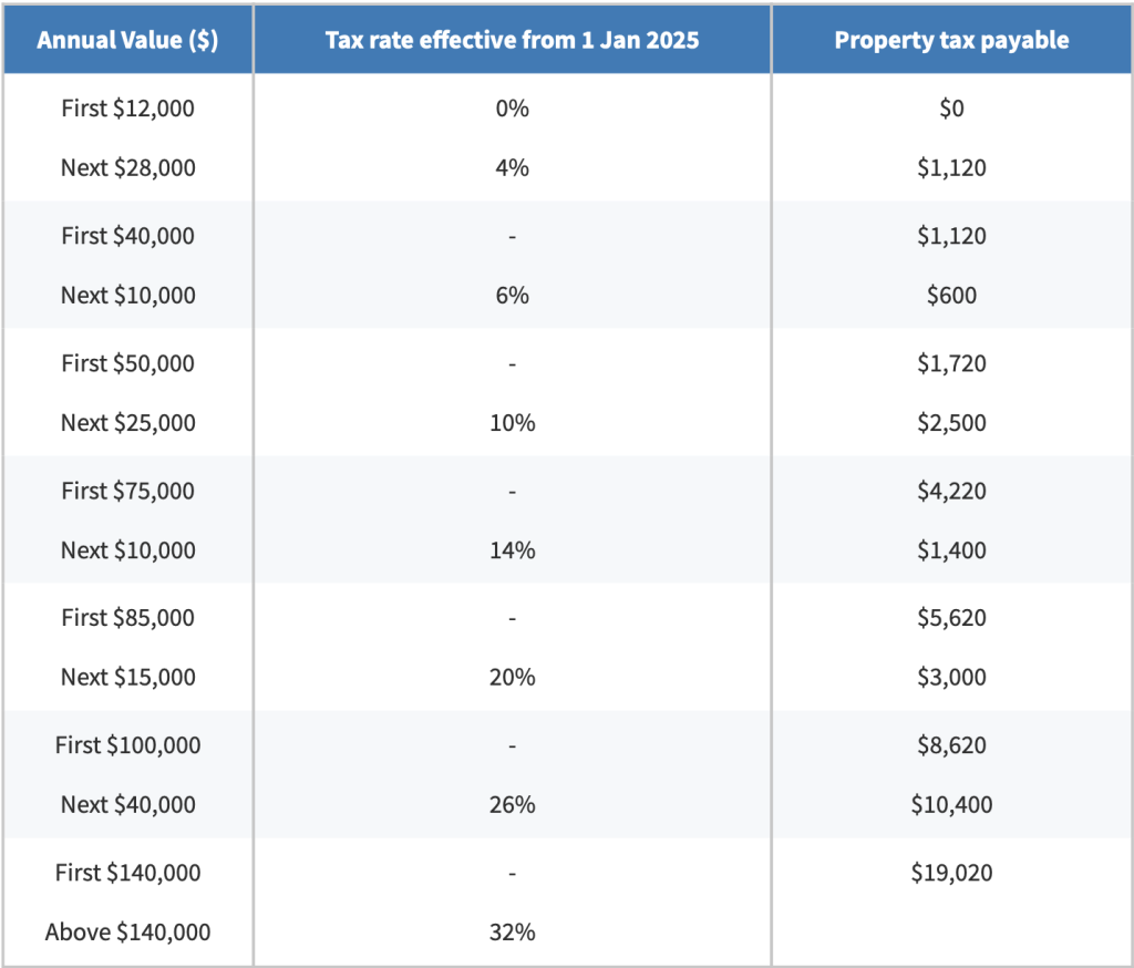 从去年1月1日开始,新加坡对这部分房产税税率做出了调整。以下是适用于2026年自住房产的税率:
