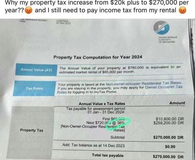 之前,就有一名新加坡人在网上晒出了自己一年要交27万新币房产税的消息: